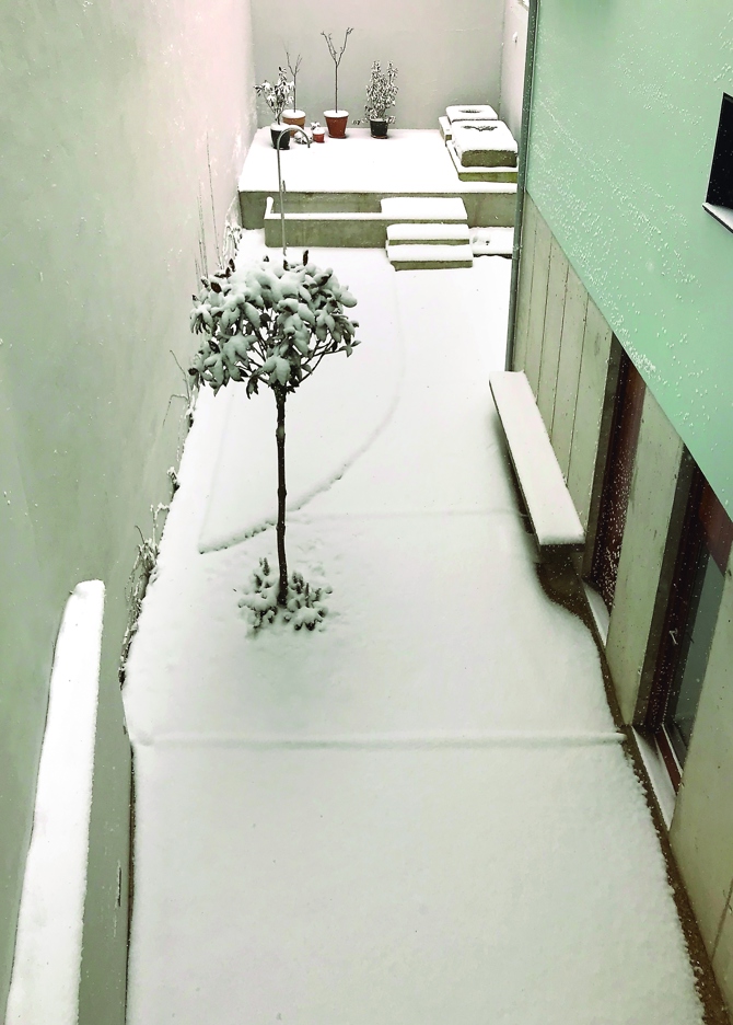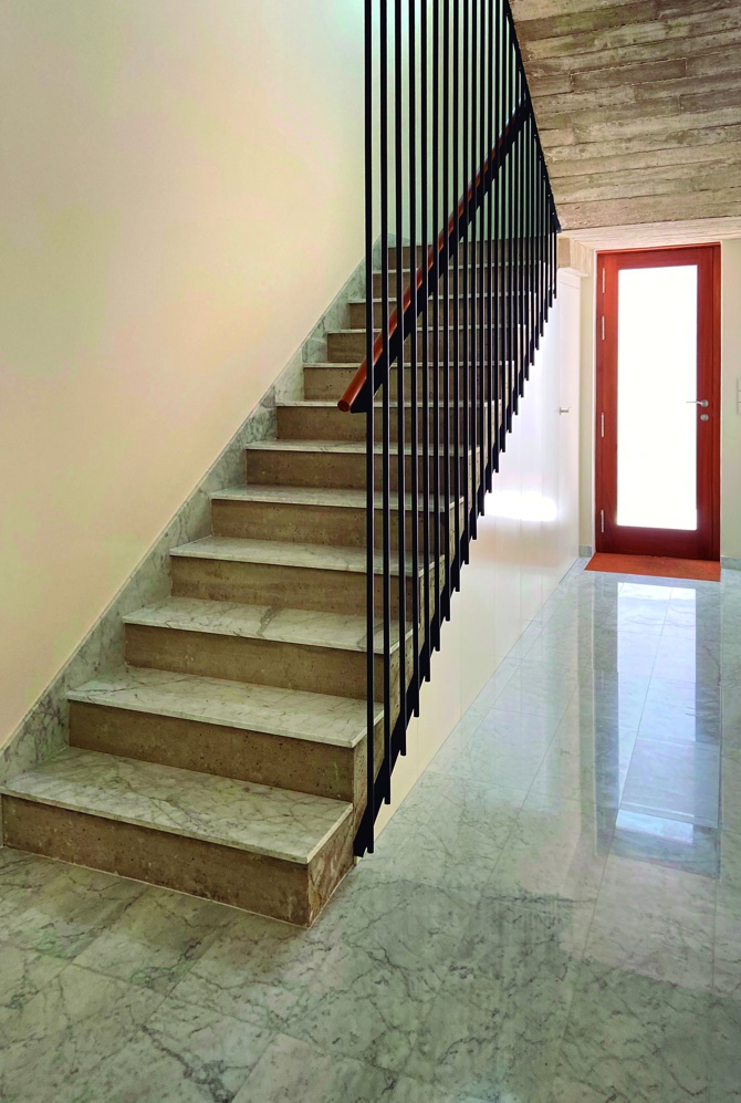 La distribución de los espacios se organiza en torno a la particularidad de la planta, situando en la parte izquierda la zona de día que se interrelaciona y se regulariza mediante elementos de obra. En ella se disponen salón, comedor y cocina, esta última situada en el volumen que se gira mirando al patio. Este espacio secuenciado se nutre de ambas orientaciones, norte y sur. Se proyecta una losa de hormigón en esta área que se extiende hasta el exterior por la terraza, y el encofrado de madera se gira en la última estancia evidenciando el cambio de dirección.
