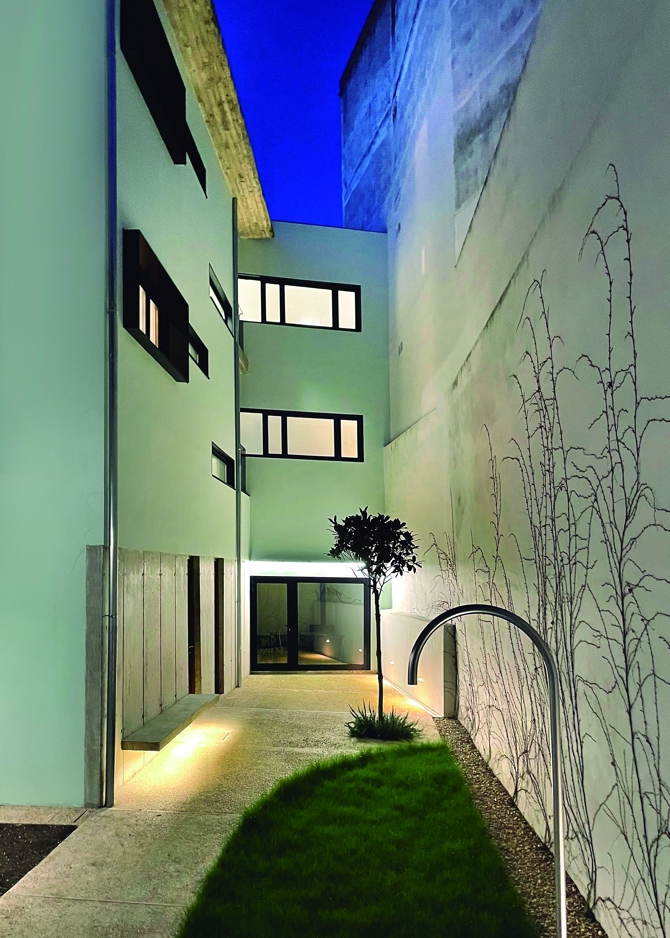 Esto mismo ocurre con la vegetación, los árboles magnolios que recorren la calle Gamazo se incorporan al patio posterior, contemplándose ambos desde los espacios interiores. Por otra parte, el color azul verdoso de las fachadas posteriores se materializa en la fachada principal mediante persianas tradicionales de madera de pino de Soria y cuerda náutica.