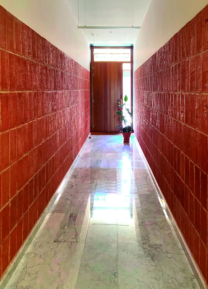 La fragmentación de la edificación se aprecia, asimismo, en la cubierta, la cual se resuelve mediante planos inclinados con vertientes a la calle y al patio a excepción del volumen mencionado que dispone de un elemento horizontal. Esto se manifiesta en las fachadas al patio donde se produce el encuentro entre ambas y el alero de hormigón armado se separa de manera discreta del plano al que acomete. Por su parte, la fachada principal de fábrica de ladrillo a conservar es restaurada y la planta que se incorpora emplea de nuevo el ladrillo, diferenciándose de la fachada existente y utilizando un lenguaje actual.