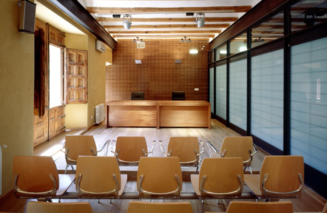 El espacio abierto del lateral izquierdo creemos que debería convertirse en el acceso privado del uso de los juzgados. De esta manera, y entendiendo la importancia que en los juzgados tiene la diferenciación de los distintos ingresos y circulaciones, aparecen de manera clara: