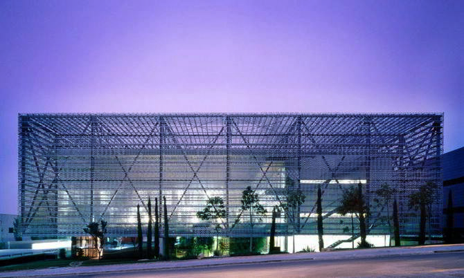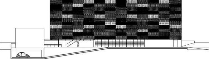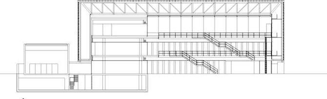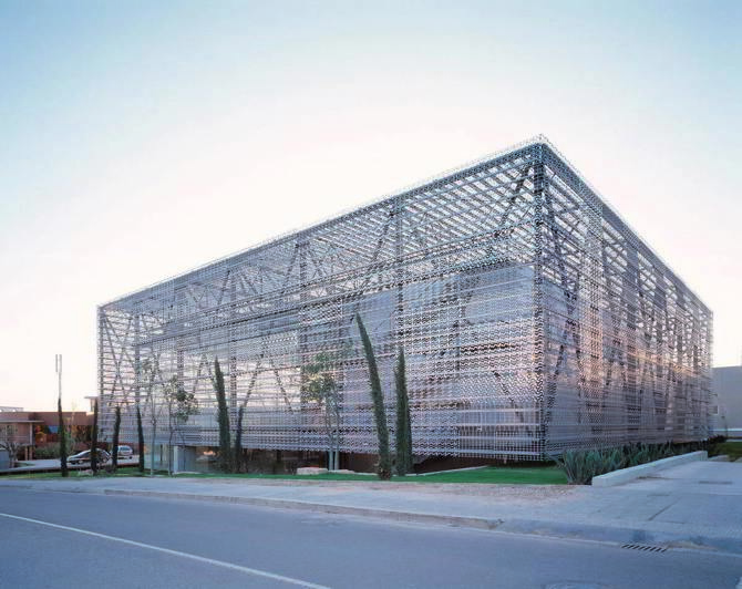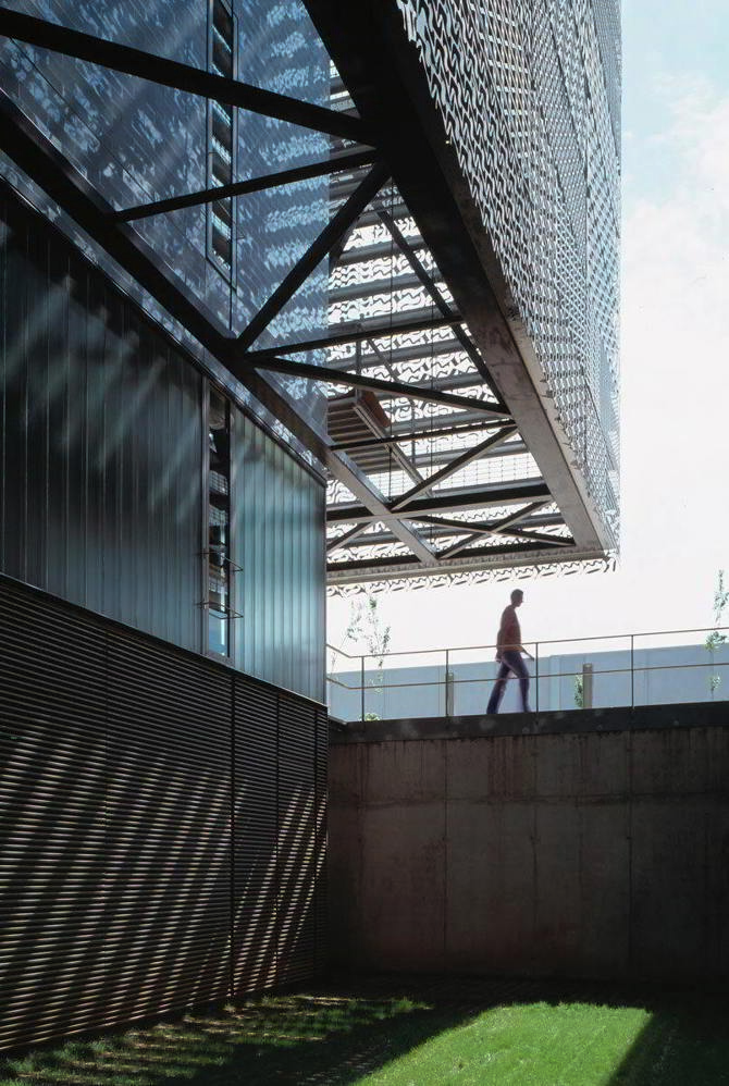 El conjunto de este cuerpo se reviste con una piel exterior formada por chapas de acero recicladas procedentes del troquelado láser de piezas industriales. Esta piel unifica la imagen del edificio y contribuye al control solar. Entre esta hoja exterior del cerramiento y la hoja interior, se disponen pasarelas de mantenimiento y las escaleras exteriores previstas para la evacuación en caso de incendio.