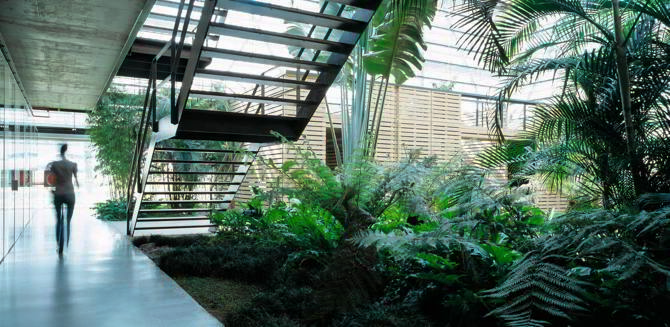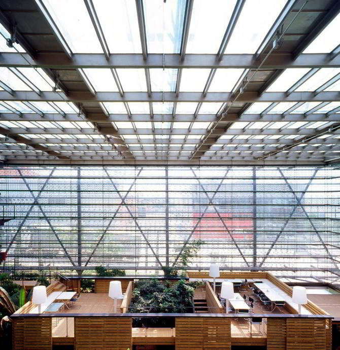 Este espacio central del edificio, orientado hacia el Sur, funciona como invernadero en invierno y como umbráculo en verano, de manera que contribuye al control climático del edificio y reduce su consumo energético. En su interior, en la planta baja, unos pabellones albergan la recepción y las salas de descanso del edificio.