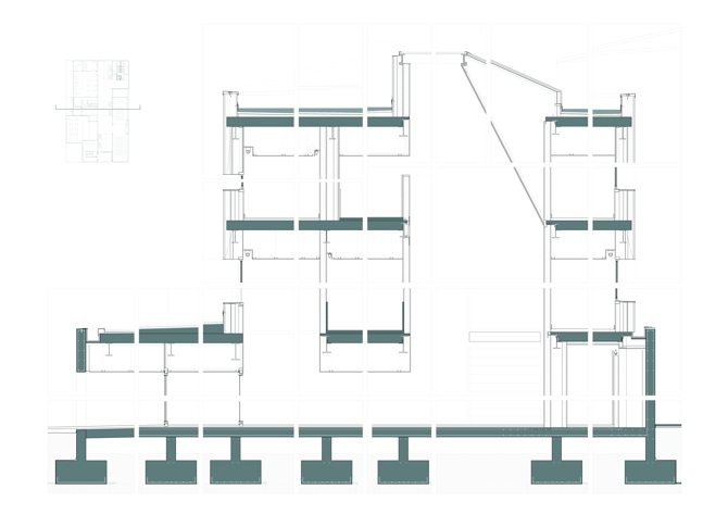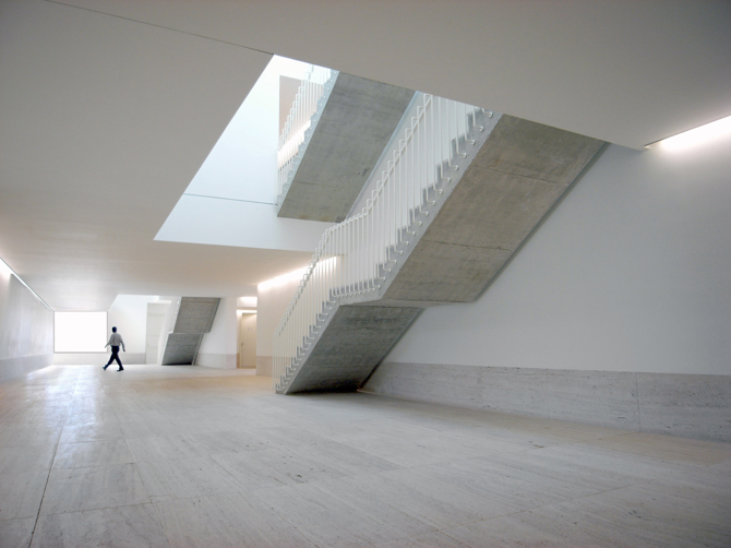 El ascenso del los prismas blancos no colmata la basa que funda el edificio. La diferencia geométrica entre dichos prismas y el cerco que recoge su luz se convierte en una secuencia de patios cuya luz se opone a la luz vertical que recorren las escaleras. Una nueva horizontalidad luminosa da habitación a las estancias más públicas: la cafetería, la administración y un pequeño oratorio. Una luz donde el hombre mide su humana temporalidad.