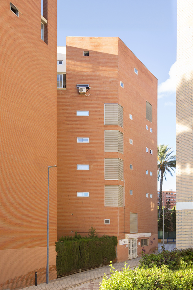El edificio, de siete alturas más planta baja, se implanta de manera rotunda en el lugar. Las dos pastillas longitudinales que contienen viviendas pasantes adecuadas al clima de Alicante, quedan unidas por los volúmenes transparentes que contienen las escaleras de los núcleos de comunicación vertical. Las fachadas de ladrillo rojo caravista presentan huecos de carácter modular que se unen donde es necesario dando lugar a huecos de mayor tamaño, con las carpinterías siempre enrasadas con la cara exterior. La planta baja contiene unos espacios porticados que la hacen permeable al uso y las viviendas de las últimas dos plantas son de tipo dúplex, para favorecer las condiciones de soleamiento del patio interior.