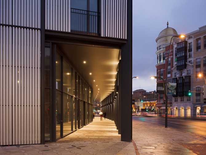 La volumetría queda definida por el tratamiento de la envolvente exterior, pautada por unas costillas estructurales a toda la altura revestidas de latón sulfurizado que generan el pórtico de acceso al llegar al suelo. El control térmico con revestimientos modulares, con el fin de controlar las radiaciones solares y las pérdidas térmicas, se preoduce mediante el tratamiento y acabado de las pieles.