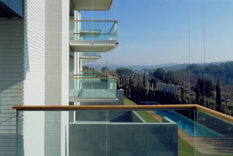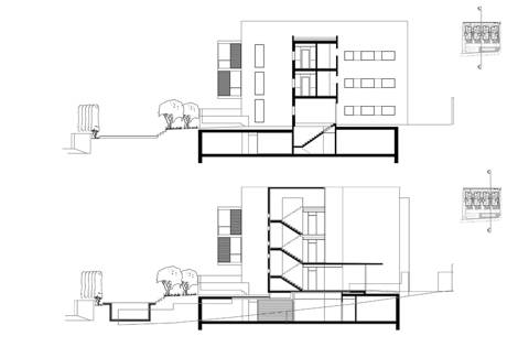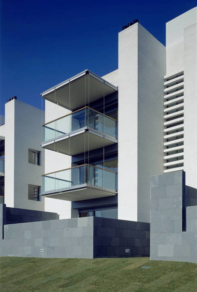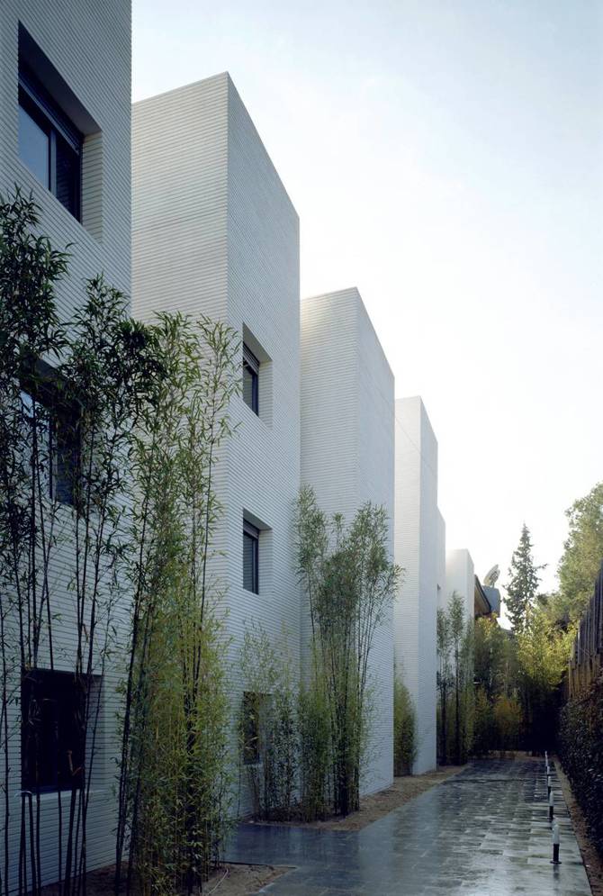 Las viviendas en tres niveles establecen una mejor relación con las zonas arboladas de la pequeña parcela abriendo las vistas desde terrazas cubiertas hacia las masas boscosas y la orientación sur. Debido a la pequeña dimensión del terreno algunas viviendas se abren directamente al jardín, recuperando las de los niveles superiores de las cubiertas del edificio.