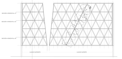 La proyección del gesto de la mano se plasma en una celosía que hiende la fachada, procurando así la sensación de compañía que produce la vegetación en la naturaleza.