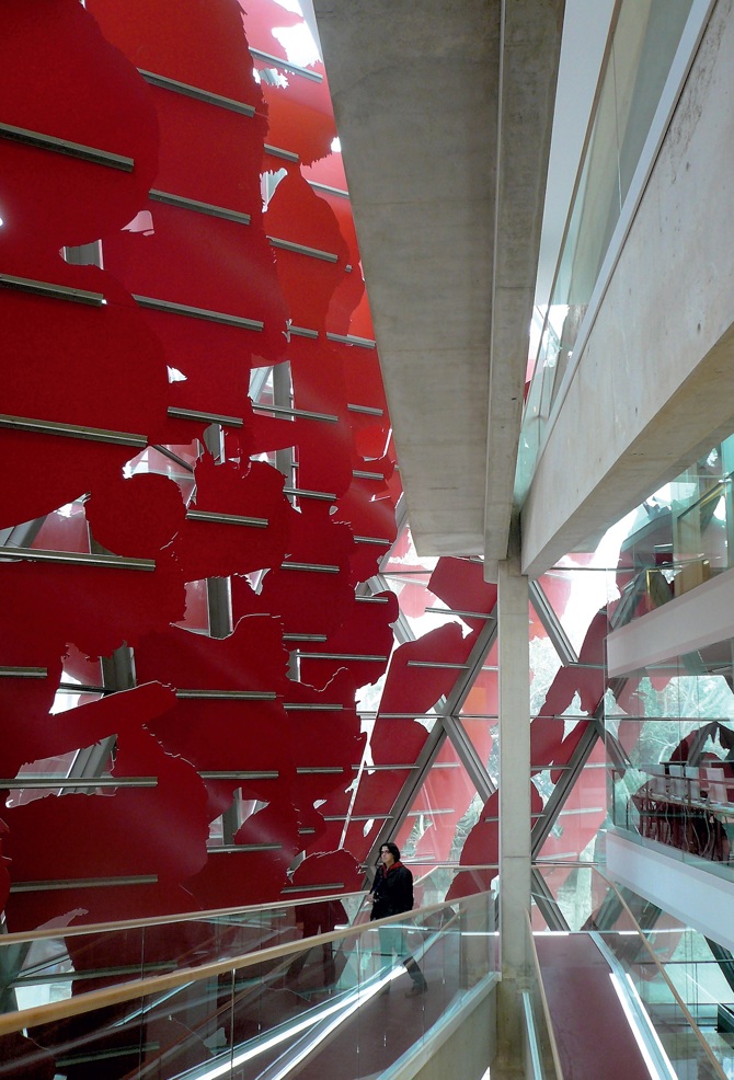 Los parasoles de aluminio lacado y formas vegetales resultaron de la selección de los dibujos más inspirados entre los ochenta que realicé. Con estas láminas se controla la entrada de los rayos solares y se producen juegos de luz y sombra en el interior del atrio.