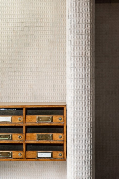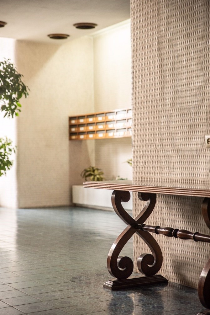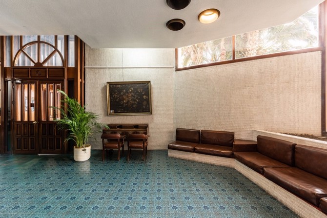 El interesantísimo portal, protegido como bien de Catalogación General, es un complemento perfecto del edificio, con unas formas fluidas pero a la vez muy funcionales que interpretan un toque local con tradicionales acabados cerámicos, algunos en pavimentos y otros más sobrios en paramentos.
