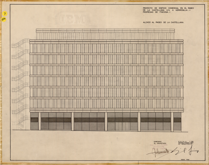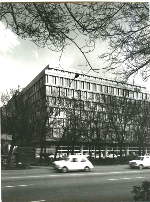 “El programa que se me propuso era crear, en cada planta, además de los enlaces verticales y servicios necesarios, un espacio para oficinas, lo más diáfano posible, que tuviera unas proporciones parecidas al cuadrado, para facilitar, de esta forma, la más libre situación de las mesas, con una fuerte iluminación artificial que garantizara la independencia de la situación con respecto a las aperturas de las fachadas, que tienen más una función de apertura al exterior, para evitar la claustrofobia, que de iluminación natural... De las soluciones estudiadas se aceptó la de un cerramiento creado con piezas huecas de hormigón pretensado y de 2 cm de espesor de paredes rellenas de material aislante que garantizara el aislamiento tanto acústico como térmico... En fachada queda claramente expresada la estructura horizontal de forjados y en las dos plantas inferiores también los pies derechos al retranquearse la fachada hasta ellos”.