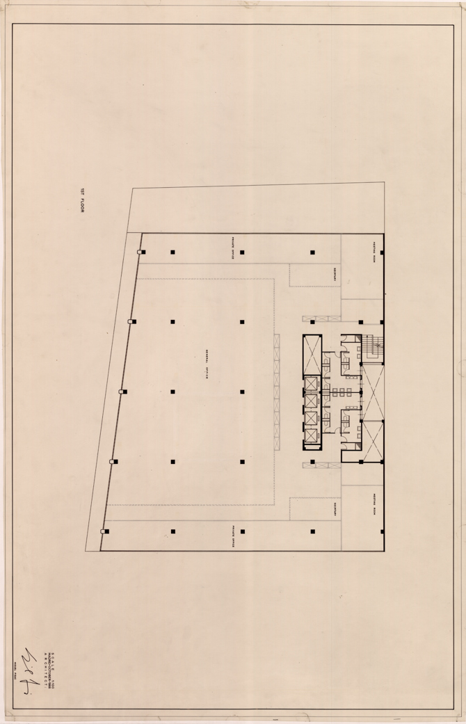 La planta del edificio sitúa en el plano medianero el conjunto de servicios y comunicaciones del conjunto: un núcleo de cuatro ascensores y huecos para instalaciones y dos núcleos de aseos detrás de los mismos. La planta queda como un gran espacio diáfano que tiene en dos de sus lados un conjunto de despachos, dejando el frente principal libre para iluminación del gran espacio central de trabajo. Cinco líneas de pilares y estructura que tienen vuelos hacia los laterales y en su frente resuelven la estructura del conjunto. Una solución, en planta, de gran sencillez y contundencia que permite la planta libre para las necesarias adaptaciones y cambios en el desarrollo del proyecto en el tiempo.