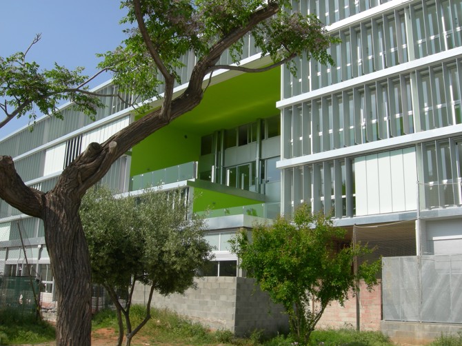 Uso del edificio las 24 horas del día con un programa que comprende: guardería infantil, centro de mayores, aparcamientos de coches, motos y bicis, viviendas para discapacitados y viviendas para jóvenes. Realizado con sistema industrializado in situ por medio de encofrado de aluminio. Sistema cero escombros. Primer edificio de vivienda social con sistema de cogeneración monitorizado.