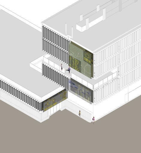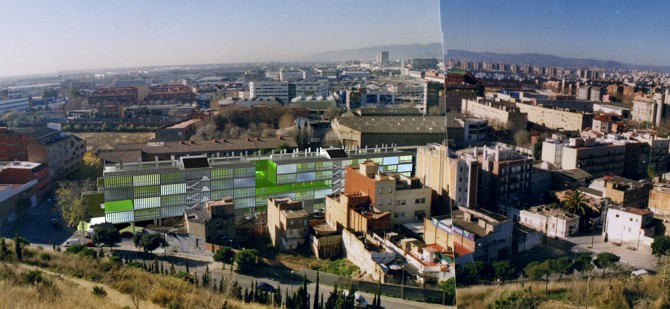 Viviendas para jóvenes en alquiler de 40 m2 con amplitud volumétrica por la altura de 3 m y la apertura total de las fachadas de cristal protegidas por lamas de aluminio verticales suelo-techo. Espacios de relación vecinal abiertos a usos no programados que vinculan en tres dimensiones la secuencia de estancias del conjunto. El edifico se abre al paisaje de Montjuic situado enfrente para establecer un diálogo.