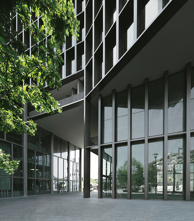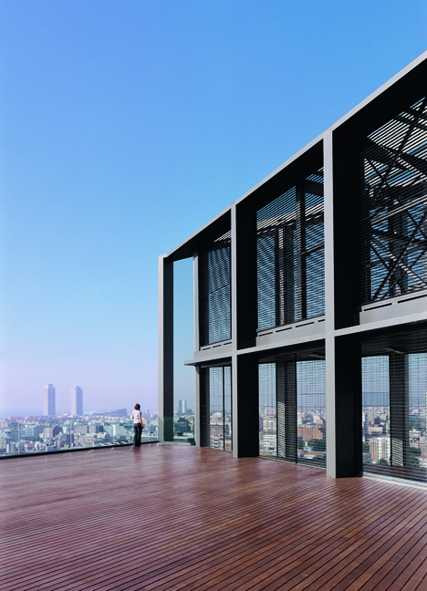 La versatilidad de la distribución interior se apoya asimismo en el empleo de un modelo único y repetido de ventana, desarrollado en continuidad en todas las fachadas, que ofrece una buena iluminación y vistas de la ciudad desde cualquier punto de la torre. Los vidrios en el interior de la retícula evitan el deslumbramiento y quedan protegidos de la insolación directa, del agua y de la suciedad.