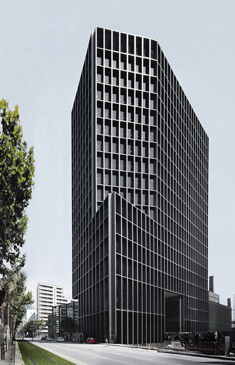 Por su situación, el diseño del nuevo edificio atiende de manera especial a las características del entorno urbano, y su volumen se ha modelado según alineaciones y directrices visuales. Así, se ha girado el testero principal para presentar una fachada frontal a la avenida; las cuatro primeras plantas se han perforado para ofrecer una salida a la calle Bolivia y focalizar su perspectiva; y en el nivel inferior, la torre se desvía del borde de la parcela para generar un nuevo plano que permite abrir las visuales del edificio colindante.