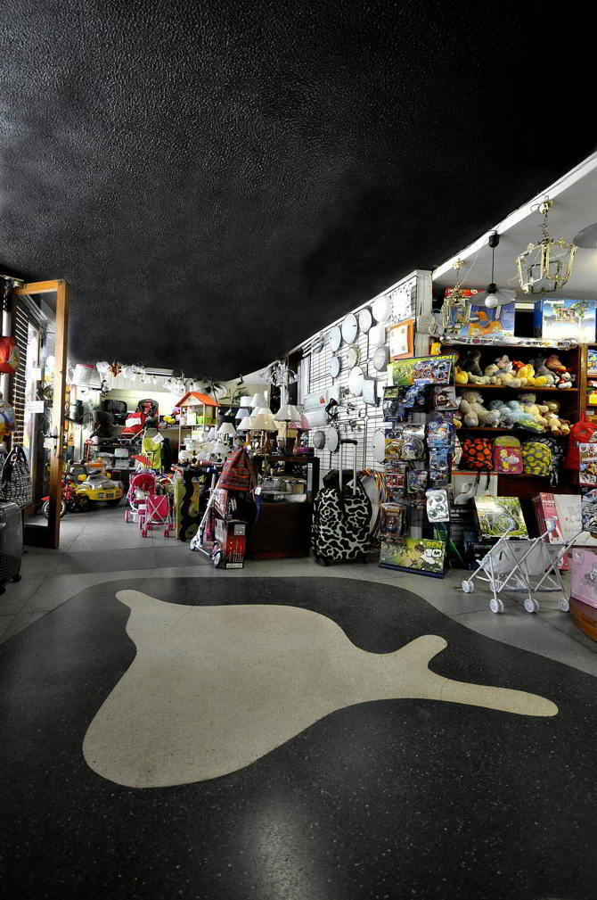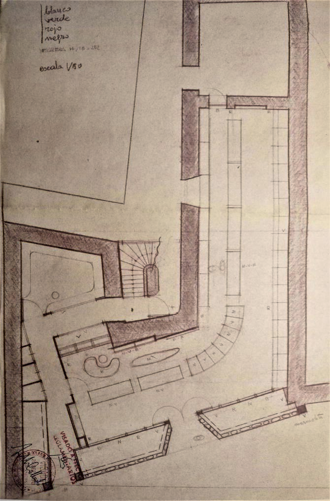 En la entrada y en el interior del local se realizan despieces de suelos inspirados en las pinturas de Jean Arp, así como pequeñas piezas expositivas con formas ameboides, que recuerdan las “constelaciones” del artista anteriormente citado.