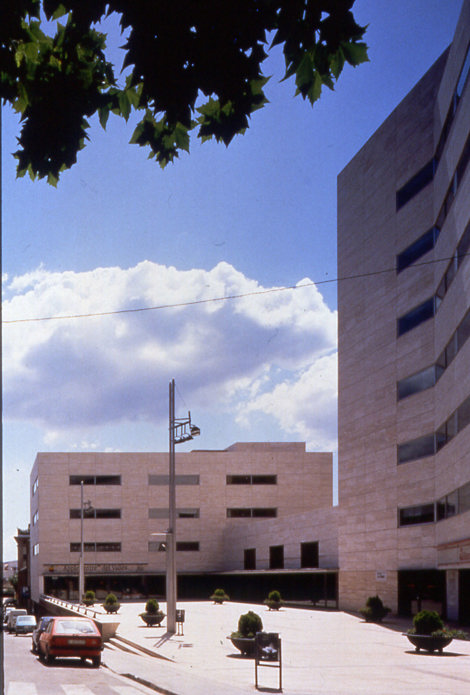 El proyecto dispuso que se construyera sobre las medianeras y se dejara una plaza pública ligada a las calles perimetrales. Las nuevas edificaciones manifiestan en su composición una clara voluntad de neutralidad frente la presencia de la plaza. Para que las dimensiones del espacio público fueran las adecuadas, el proyecto se resolvió con poca profundidad y un programa de oficinas. Un vacío intencionado entre las edificaciones propicia la entrada del sol en la plaza. Por debajo el nivel de la plaza se proyecta un aparcamiento público para hacer rentable la operación.