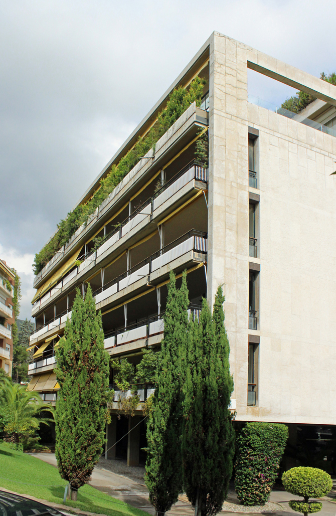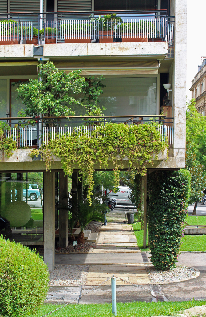 Casi todas las características de este edificio se pueden relacionar con los cinco puntos de arquitectura moderna de Le Corbusier, aunque con algunos matices que lo hacen muy singular. El edificio está levantado sobre pilotes de hormigón armado y el vestíbulo está separado de las fachadas. Este vestíbulo consiste en una caja completamente de vidrio, con lunas de superficie muy grande. También está separado del suelo, creando una línea de sombra que refuerza la sensación de ligereza del edificio. Justo a la entrada, se ha dispuesto una fuente con un chorro de agua que provoca un sonido muy agradable al entrar.
