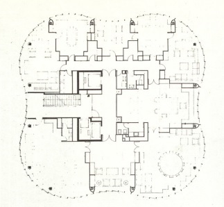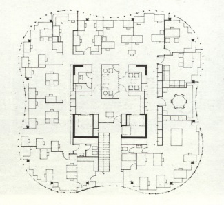Este proyecto está basado en una composición volumétrica obligatoria. Se han proyectado los distintos edificios con formas curvas para evitar la agresividad de las esquinas en un conjunto tan denso. Se ha utilizado muro cortina en diente de sierra para adaptarlo a las curvas y para aligerar el edificio. No se ha tenido en cuenta la orientación por exigirse vista libre en todas direcciones, pero el sistema de calefacción, refrigeración y acondicionamiento del aire es automático y funciona invierno y verano. Durante el invierno funciona a veces la refrigeración y la calefacción automáticamente a medida que varía la posición del sol.