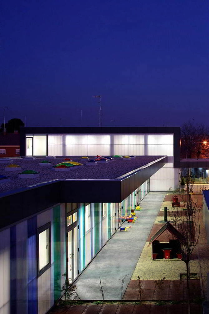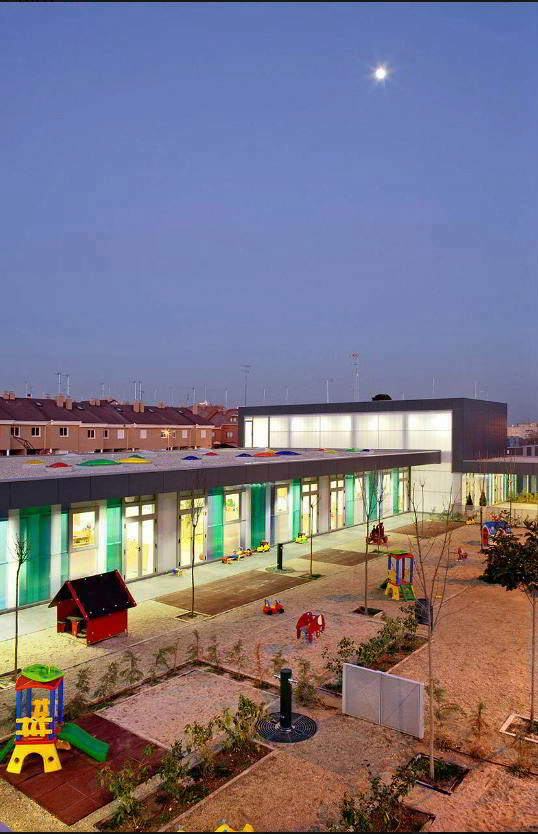 El espacio exterior es una zona de juegos sobre la que se organizan los distintos programas de la planta baja, contando todas las áreas con un acceso directo a ella. El edificio alberga usos enfocados a cuidar y educar, distinguiéndose cinco zonas. En la planta baja encontramos una casa de niños/as en la parte oeste, destinada a atender a niños/as de uno a tres años; aulas orientadas a la educación infantil (de tres a seis años), que se localizan en el centro del edificio; y servicios para la escuela al este del edificio. En la planta superior se establecen zonas para uso del profesorado.