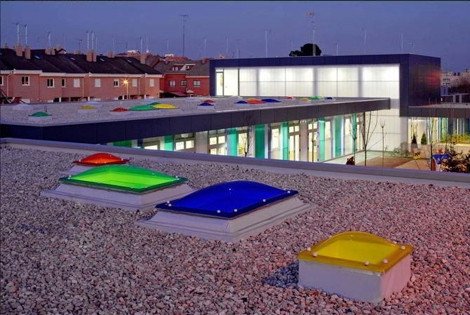 Los espacios interiores refuerzan su conexión con el patio a través de la envolvente de la fachada sur, compuesta por una alternancia de paneles opacos y translúcidos de policarbonato y por amplios ventanales. Esta característica de permeabilidad entre el interior y el exterior se posibilita gracias a la organización compacta de la planta, conectada internamente por un solo pasillo donde se encuentra también el acceso a la planta superior. Las fachadas exteriores se cierran a las residencias mediante el uso de paneles opacos y pequeños huecos. Como refuerzo lumínico en espacios interiores se diseña un sistema de lucernarios en la cubierta. El patio se zonifica mediante el uso de distintos materiales de pavimento. Caracteriza distintas áreas para generar actividades específicas, distinguiéndose zonas de tierra, de caucho o de vegetación, y huerto.