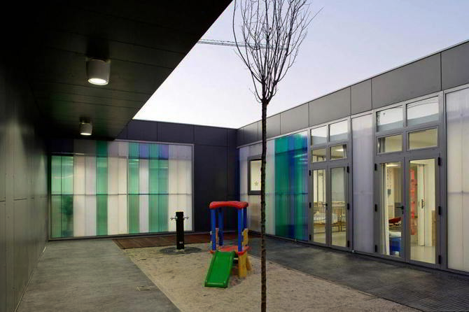 La obra se centra en facilitar la actividad de cuidado y vigilancia de las niñas y los niños a través de la transparencia y la comunicación directa de los espacios, teniendo en cuenta la escala y los comportamientos de sus usuarios/as. La jerarquización del patio y la articulación de los espacios en torno a él demuestra un entendimiento de qué lugares son más necesarios y relevantes en la experiencia de un/a niño/a. Los materiales translúcidos y de colores y el diseño de la planta giran en torno a esta intención de recrear un ambiente seguro y estimulante, con abundante luz y espacio para movilidad.