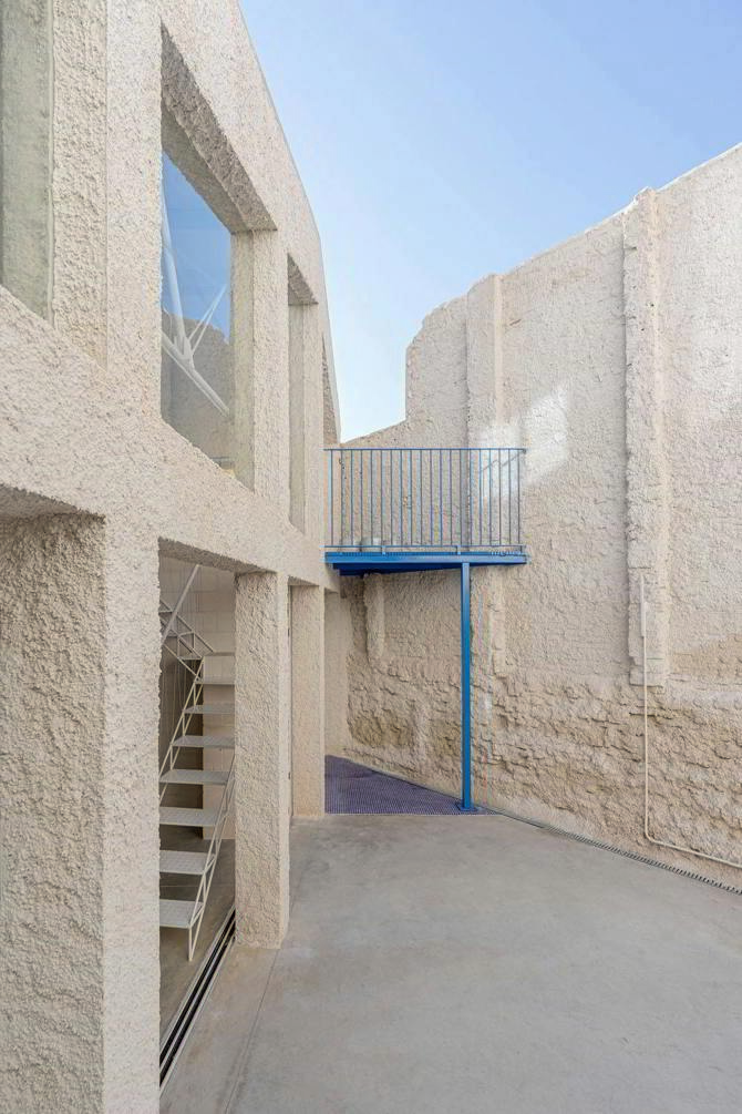Se prioriza la conservación de materiales originales, eliminando solo los dañados o nocivos. Predominan el mortero, bloque de cemento, hormigón pulido y cerrajería lacada para resaltar elementos clave.