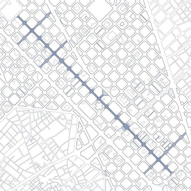 A lo largo de la calle, se propone una secuencia de zonas de encuentro formado por las plazas, en los cruces entre los cuatro primeros Ejes Verdes verticales, y las semi-plazas, situadas en los chaflanes y en medio de los tramos de calle. Este ritmo de espacios se mantiene constante para homogeneizar todos los tramos. El objetivo es generar zonas de reposo, con mobiliario urbano y una materialidad diferente, la piedra natural, que destaca frente al panot del resto de la calle.