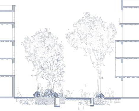 Esta apropiación de la calle es protagonizada en segundo lugar por la naturaleza. Apostamos por la máxima renaturalización de la calle: el patrimonio vegetal existente se conserva y se regenera con alcorques más grandes, se incrementa con la plantación de nuevo arbolado y vegetación arbustiva, y se modifica la composición del subsuelo, generando una base porosa y drenante. Para cerrar el ciclo natural del agua, se implementa una nueva red de freático para el riego y limpieza y, se devuelve el agua de lluvia al acuífero a través de sistemas de drenaje sostenible (SUDS).