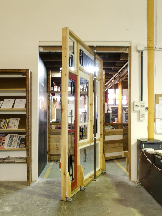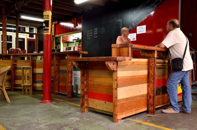 La zona de entrada destaca por una barra equipada con una cocina móvil, realizada completamente con materiales reutilizados. La mayor parte de la madera procede del falso techo de la fábrica original que se desmontó en planta primera. Este espacio duplicó su superficie en 2013 al anexarse una sala contigua. Esta operación permitió la construcción de una escalera-grada que conecta con el primer piso y resuelve las circulaciones de todos los espacios del equipamiento, que a su vez sirve como escenario para actos de pequeño formato del bar.