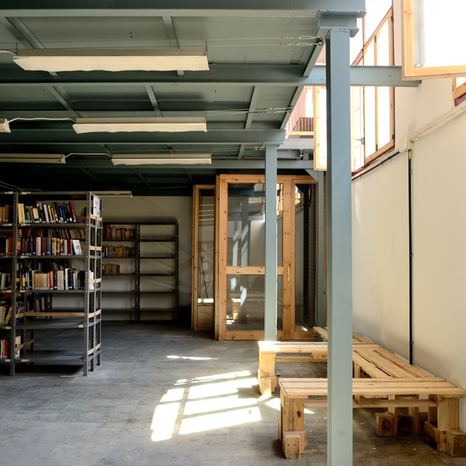 La biblioteca era uno de los equipamientos más largamente demandados ya que la Bordeta era de los pocos barrios de Barcelona sin tener una. Así que fue el primer espacio que se decidió habilitar en una de las áreas en mejor estado y más accesibles. Fue necesario vaciar toda la sala de las grandes estructuras metálicas para palés, construir un baño nuevo y una nueva entrada posterior. También se cortó el forjado del altillo para permitir la entrada de luz, recuperando ventanas que habían quedado inutilizadas. Esto generó la necesidad de nuevas barandillas que se diseñaron economizando materiales (hilos encontrados en la misma nave) y con las habilidades que poseían los voluntarios que tenían que construirlas (trabajo con madera y hierro).