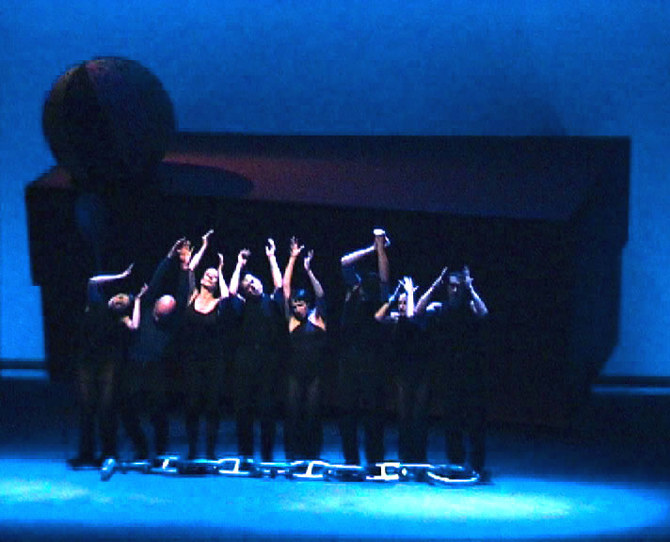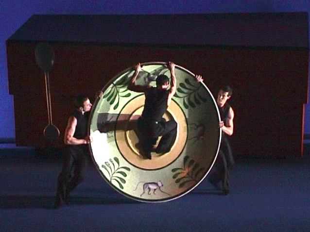 En este caso se utilizó una manifestación cuyo diseño y realización recurrió a la colaboración de coreógrafos y arquitectos. Este evento, promovido por Hermès para celebrar el nuevo milenio, se inspiró en el diálogo entre los perfomadores humanos y una serie de objetos que hacían referencia a la firma promotora. Las dimensiones reales de estos objetos se ampliaron hasta alcanzar proporciones gigantescas para darles protagonismo en la representación.