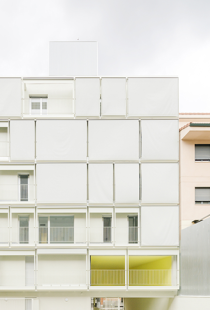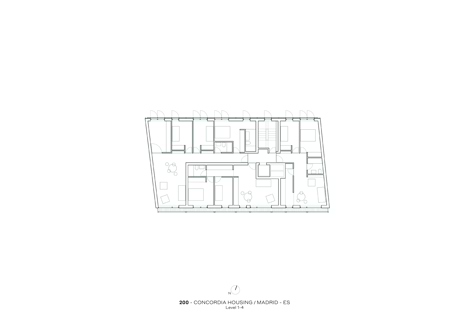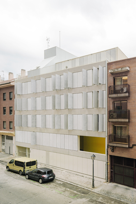 La Ordenanza de aplicación, al restringir la edificación a una crujía alineada a la calle de 12 m de fondo, genera espacios interiores que se ocupan con piscinas y jardines, algo no muy frecuente en el barrio y que otorga una calidad singular a estos desarrollos. El proyecto se sitúa en la segunda manzana de la calle, entre medianeras, y construye el volumen máximo permitido por la Ordenanza: una planta trapezoidal de 22 x 12 m, coincidente con las lindes del solar, con algo más de 14 m de altura de coronación.