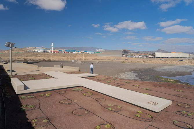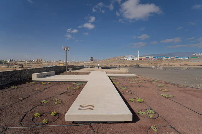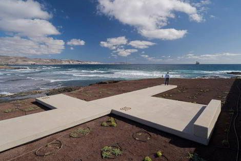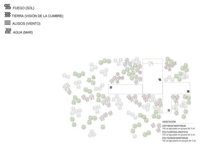 En contraposición a la gran superficie existente de acceso, se crea un mirador con 4 microespacios de contemplación diferenciados del paisaje de 4 elementos: tierra –visión de la cumbre–, aire –viento–, fuego –sol– y agua –mar–; todos ellos próximos al yacimiento arqueológico, que pone en valor a cada uno de ellos a través del reconocimiento de los límites de la intervención. Además, se propone en el borde de la plataforma con vegetación halófila costera, propia de la zona, que enriquecerá la estancia temporal del visitante y evitará la continua erosión del terreno que pudiera poner en peligro los límites físicos del borde costero, evitando desprendimientos.