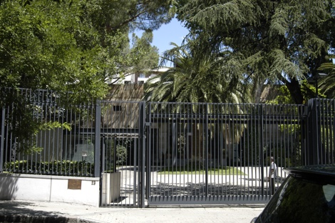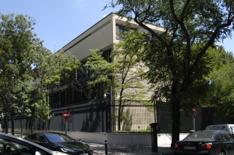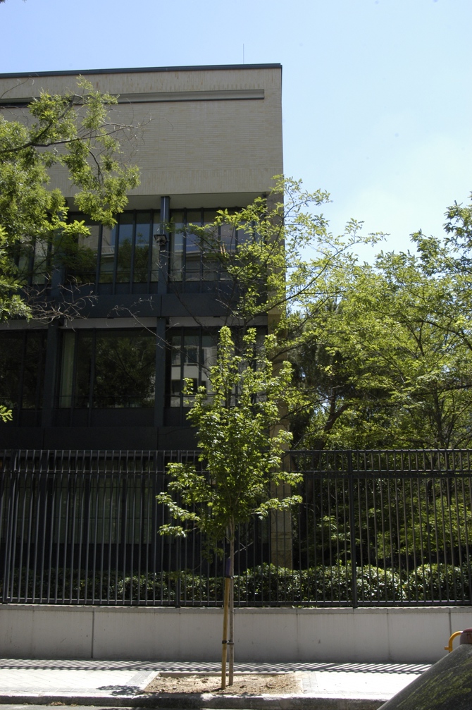 La embajada alemana se organiza a partir de dos edificios, uno longitudinal con fachada a Fortuny, de cuatro plantas, que aloja las oficinas y despachos de la representación diplomática, y otro de dos plantas sensiblemente cuadradas en torno a un patio central, que alberga la residencia del embajador y que se halla situado exento en el centro del jardín pero unido al anterior mediante una pequeña terraza a nivel de la planta principal. Este esquema permite revalorizar el jardín, con proyecto del paisajista A. Reich y reforma de Pedro de Diego, que se complementa con los patios ajardinados interiores, justificándose en la memoria del proyecto el empleo de materiales típicos del país y la región: granito, celosías, materiales cerámicos... Asimismo intervino el escultor F. Koenig.