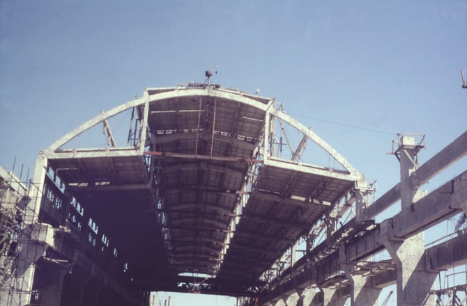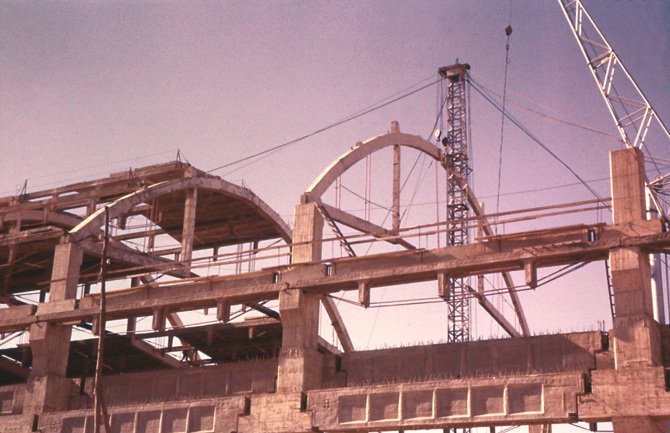 Las naves se cubren en la zona central sobre el arco y en las zonas laterales sobre unas vigas que cuelgan de los arcos. La pared vertical que se forma entre estas dos cubiertas sirve de lucernario y como elemento de arriostramiento. Los arcos son triarticulados y se prefabricaron por mitades en posición horizontal. En la maniobra de izado se tuvo especial cuidado para controlar las flexiones transversales que podían provocar fisuraciones no deseadas.