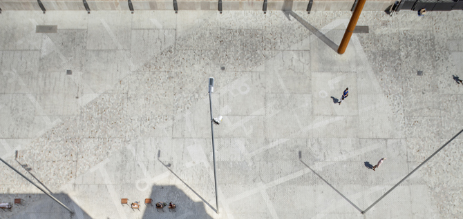 Se genera un vacío alrededor del edificio para responder a su monumentalidad. El pavimento es el vínculo con la historia y la memoria del lugar. Por un lado, la historia: el trazado de las calles antiguas mediante cambios sutiles de adoquín, y la reproducción de los elementos construidos allí donde se desenterraron yacimientos, mediante grabado en el pavimento. Por otro lado, la memoria reciente: el pavimento continuo de adoquín de granito hace la conexión sensorial con el imaginario colectivo, de cuando el mercado activaba el barrio. Gran parte de los adoquines están extraídos y reutilizados en el propio ámbito.