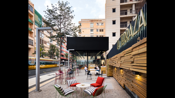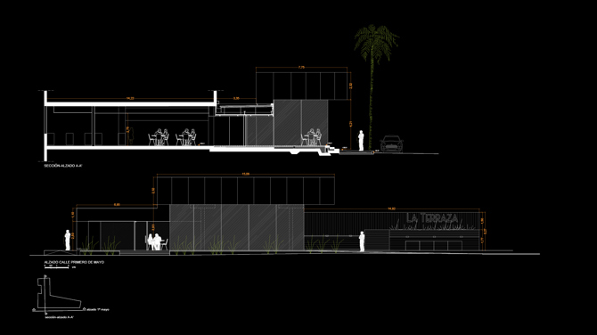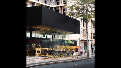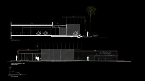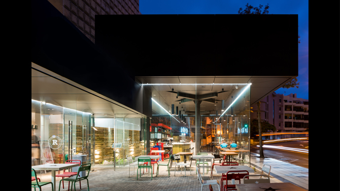 El volumen envolvente que limita los dos programas, cafetería y hamburguesería, que se desarrollan en el interior, ocupan cada uno parte del espacio libre como un gusano en el interior de una manzana, sin poder sobresalir de la piel. A pesar de la dualidad impuesta, que da paso a volúmenes engarzados con los vacíos que se configuran juntos como un solo cuerpo de imagen unitaria, que “como en la parábola del ciego y el tullido, juntos demostraron ser más de lo que podrían haber imaginado ser de forma individual”.