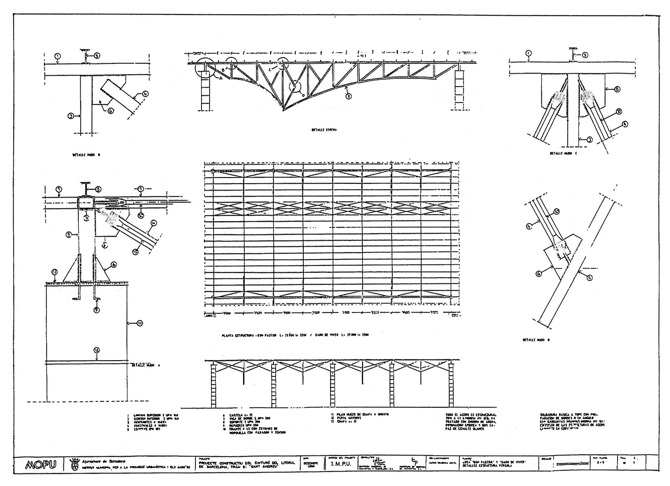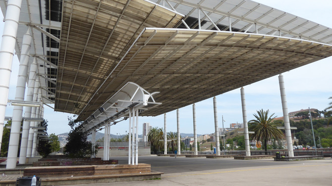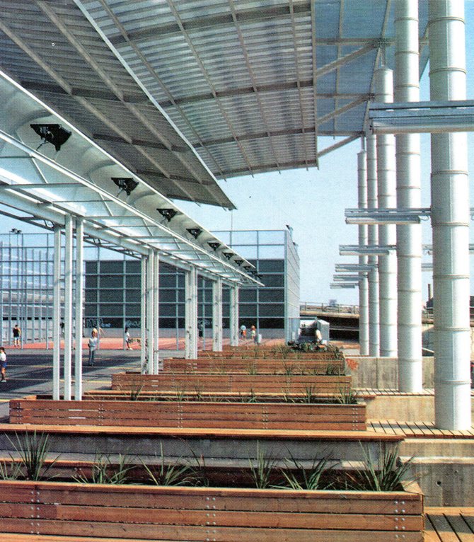 Las aguas se recogen en forma de cascada en el interior a través de un gran canalón que también actúa como soporte de los focos de iluminación. La superposición de dos láminas hace de difusor de la luz, como si se tratase de una nube, y consigue calidades variables según los diferentes ángulos. Las cerchas se sitúan entre las dos láminas. La inferior va apoyada sobre los cordones inferiores tapando la estructura y queda separada de los pilares. Por este motivo parece que flote contribuyendo de este modo a la ligereza del aspecto general. Es un modelo de pérgola-umbráculo que podría utilizarse para proteger los espacios públicos en climas cálidos y obtener así iluminación cenital y control solar.