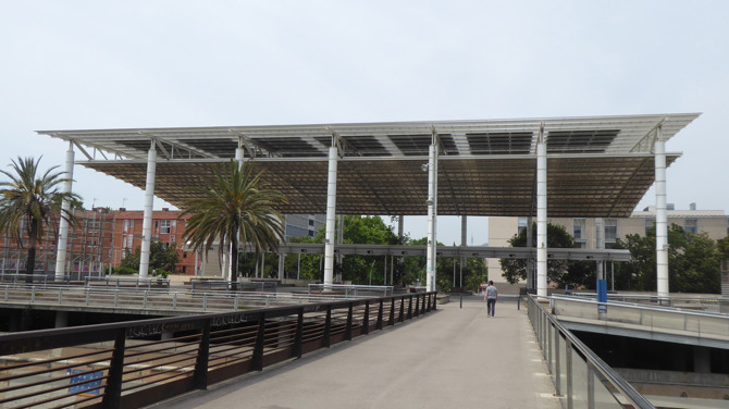 Las partes más visibles, o sea, las pérgolas, el frontón, las pistas de tenis y los edificios se adaptan a las directrices del río. Las jardineras escalonadas y las escalinatas de acceso son paralelas a la trama urbana, mientras que la distancia variable entre pilares de soporte de las losas se adapta al trazado del cinturón. Las losas quedan abiertas por el lado del río para iluminar el cinturón. Están perforadas con una secuencia de aberturas que, además de la iluminación natural, dejan pasar las grandes palmeras del paseo superior. El conjunto puede interpretarse como una fachada de la ciudad o como frente fluvial, con dos puntos de referencia urbana que son las pérgolas y un gran paseo mirador o balcón al río. La cubierta de las pérgolas está tratada como un umbráculo de grandes dimensiones. Tiene dos láminas superpuestas, la superior, prácticamente horizontal, es una celosía de pasamanos que matiza el paso del sol. La inferior, curvada hacia el rio y hacia la ciudad, asegura la impermeabilidad.