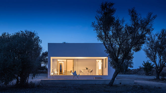 La propuesta se fragmenta en tres volúmenes que ordenan el programa a la vez que lo dotan de un grano más pequeño y acorde con la escala del paisaje. De sur a norte, el primer cuerpo aloja un porche que ofrece protección solar, el segundo contiene el programa de carácter más público y el tercero dos dormitorios. Entre ellos se encuentran franjas transversales que separan físicamente los volúmenes aportándoles ventilación e iluminación, y les dota de servicios y conexiones. Delante de la vivienda se ubica un aljibe que la hace autosuficiente en términos de abastecimiento de agua a la vez que ofrece un solárium para los meses más fríos del año.