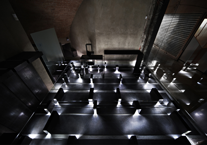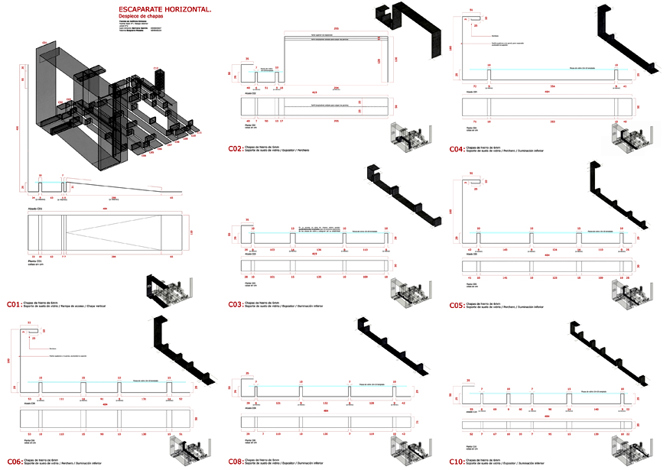 La construcción del escaparate horizontal, que acondiciona el local para su uso como tienda, se realizó con chapas de hierro de 6 mm de espesor que son soporte para el suelo de vidrio, los artículos expuestos y el sistema de iluminación. Las placas de LED, que se sostienen bajo las chapas mediante imanes, los fabricamos artesanalmente recortando tiras de LED, soldándolas entre sí y pegándolas a soportes de cartón a los que habíamos adosado una tira imantada en el lado opuesto.