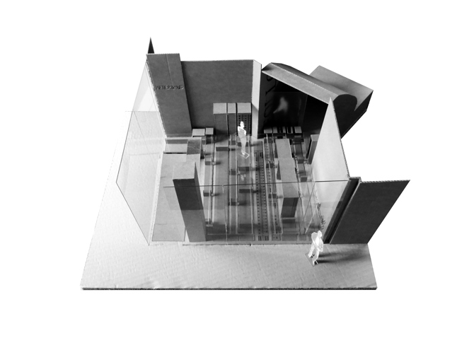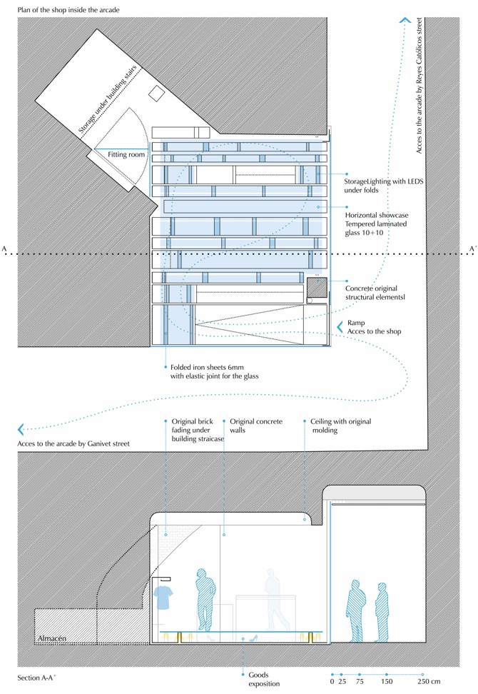 Nuestra propuesta consiste entonces en subvertir el concepto tradicional de escaparate, explorando la posibilidad de difuminar los límites entre el espacio privado y el espacio público en una tienda de ropa. De esta forma, se pueden generar intercambios entre espacios de distinto carácter. La tienda dota al pasaje comercial de aire liberando la esquina, 24 horas de luz y un programa de actividades capaz de atraer visitantes a este lugar: sesiones de música –el cliente es DJ–, exhibiciones de break dance o proyecciones. El pasaje, por su parte, cede su superficie y puede ser ocupado temporalmente como extensión de dichas actividades y del área expositiva de la tienda.