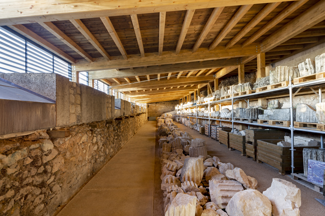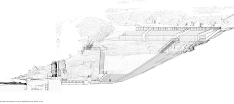 Una pasarela de madera tras el muro de la escena permite la circulación de actores para la entrada en escena. Bajo ella y con objeto de proteger las subestructuras y realizar un anticuario, se ha construido un pabellón semienterrado que completa el conjunto del edificio, configurando una arquitectura completa constituida a partir de los elementos prexistentes junto a las nuevas incorporaciones, provocando una relación entre monumento y paisaje.