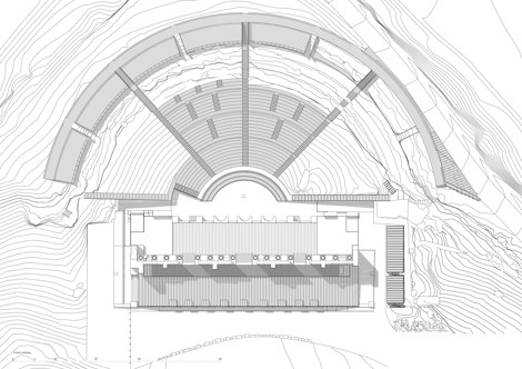 Se reconfigura el edificio escénico del antiguo teatro, incorporando un lenguaje arquitectónico contemporáneo, que posibilita la realización de festivales estivales y genera una nueva función en el espacio residual cubierto, donde se exponen los restos de la decoración de la escena y se habilitan los vestuarios para las eventuales representaciones.