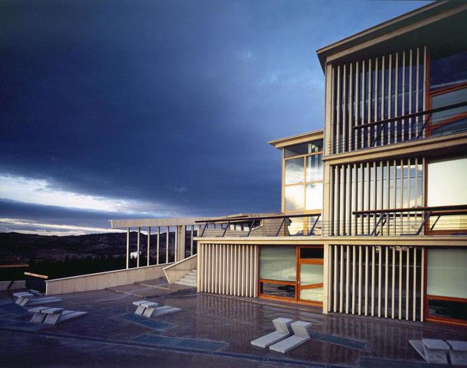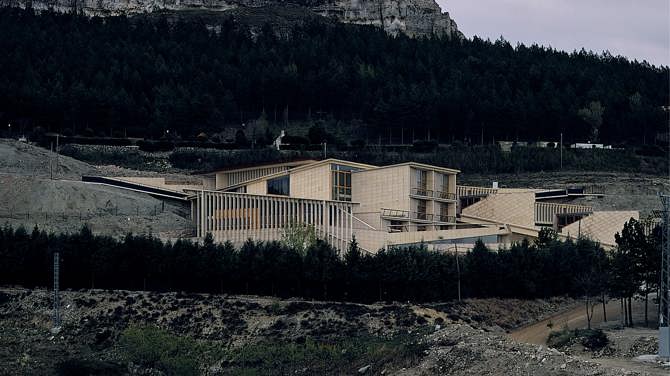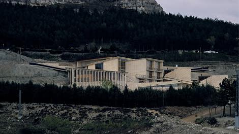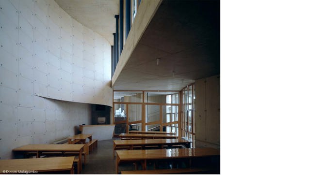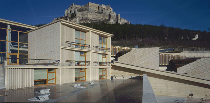 Lo singular y escarpado del emplazamiento sugirió seguir el trazado de las curvas de nivel en la disposición de las tres partes del conjunto, vinculadas entre sí por un equilibrado sistema de espacios exteriores con rampas, muretes y plazoletas. Dos pastillas estrechas albergan las aulas, mientras que el cuerpo de dormitorios, con piezas trapezoidales hiladas por un pasillo quebrado, desciende en zigzag por la pendiente. El punto de convergencia es la sala multiusos con el bar, que incorpora los vestíbulos. A través de la fragmentación y el escalonamiento de los volúmenes cobra especial importancia, por una parte, el sistema de cubiertas, que son aquí cuarta fachada del edificio y lugares de estancia o acceso; y por otra, se consiguen espacios interiores luminosos y abiertos, donde se tiene la sensación de estar suspendido en el paisaje.