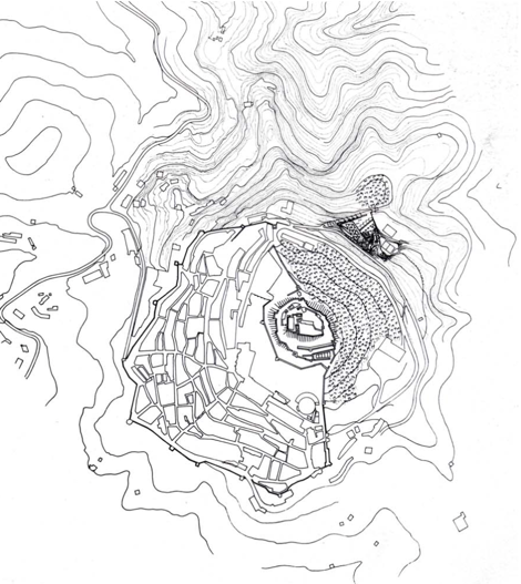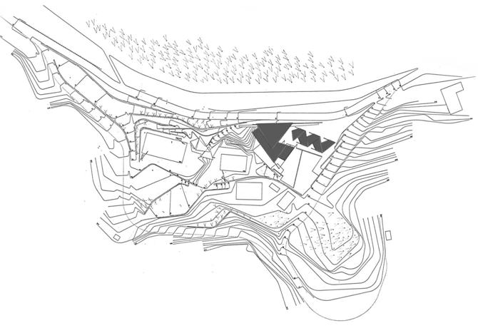El edificio repite el movimiento del pueblo hacia la mejor orientación. Este giro sobre sí mismo desde el nivel de entrada facilita la ubicación de las aulas y los dormitorios. Por otra parte, las zonas comunes forman el límite externo del edificio, que sigue los contornos del terreno. El techo funciona como auténtica fachada del edificio, lo que hace ver que el edificio es un camino y un vestíbulo. Diferentes niveles de rampas, canchas de juego y celosías aparecen bajo el techo contra la pendiente. El vestíbulo se repite en el patio de entrada. De aquí parte la rampa de acceso, la construcción sobre la que se sostiene toda la geometría de la superficie. Esta rampa sustenta la excavación que completará el edificio hasta volver al nivel inicial.