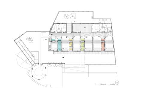 Planteamos el proyecto como una “macla” entre el edificio existente y la nueva construcción. El nuevo edificio se estructura en franjas, que penetran más o menos en el antiguo, en función del programa: Interiormente, la planta funciona como una gran calle central, que recorre las aulas y acoge los espacios de uso común como el de psicomotricidad y el comedor. Las aulas entre sí están comunicadas. Los núcleos de cambiadores y baños se colocan entre ellas para limitarlas y compartir servicios. Superponemos diferentes cotas de transparencia para niños y cuidadores. Transparencia pasillo-aulas / núcleos-aulas / aulas-aulas / aulas-patio...