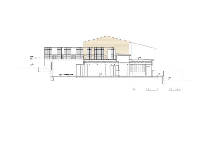 Nos pidieron construir una guardería ampliando la planta baja de una masía existente. En la planta primera se quería, además, una sala polivalente con un acceso independiente. La sección en terraza del solar nos obliga a acceder a la escuela bajando con una doble rampa y nos permite acceder a la sala polivalente con una pasarela prácticamente a cota de terreno.