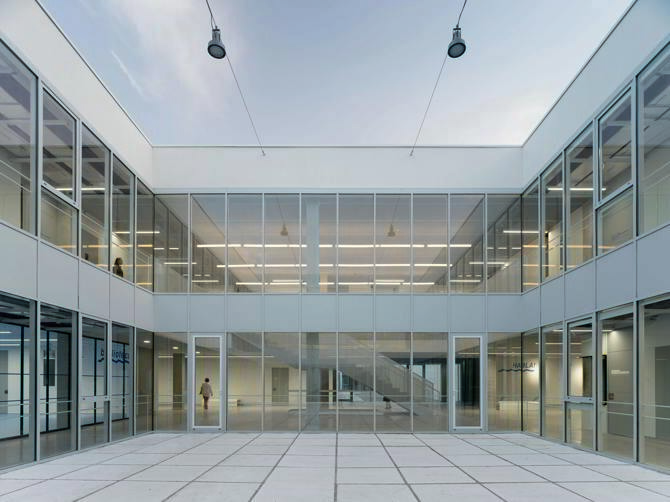 El interior se proyecta, por oposición, como un espacio tecnológico, blanco y luminoso con alusiones formales a la arquitectura industrial, de producción y creación.